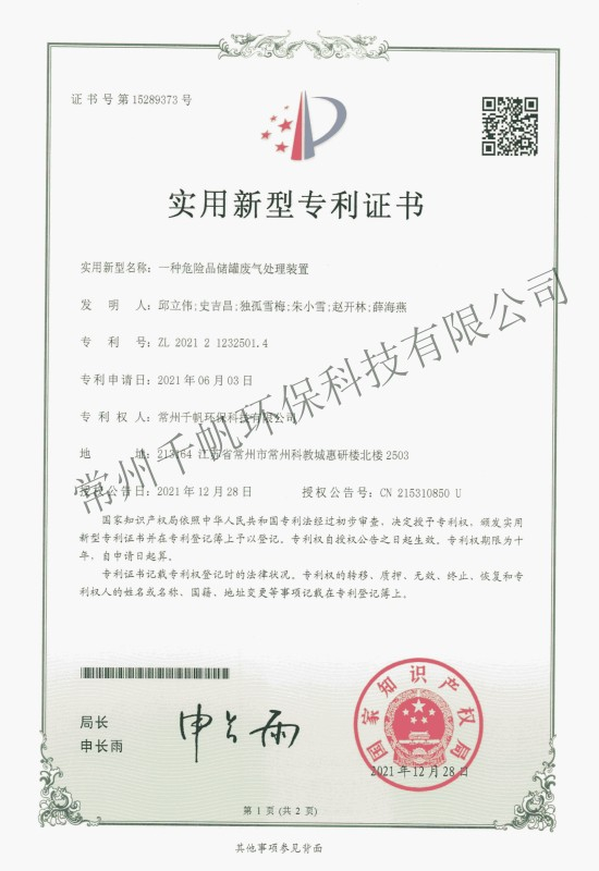實(shí)用新型專利證書 一種危險品儲罐廢氣處理裝置